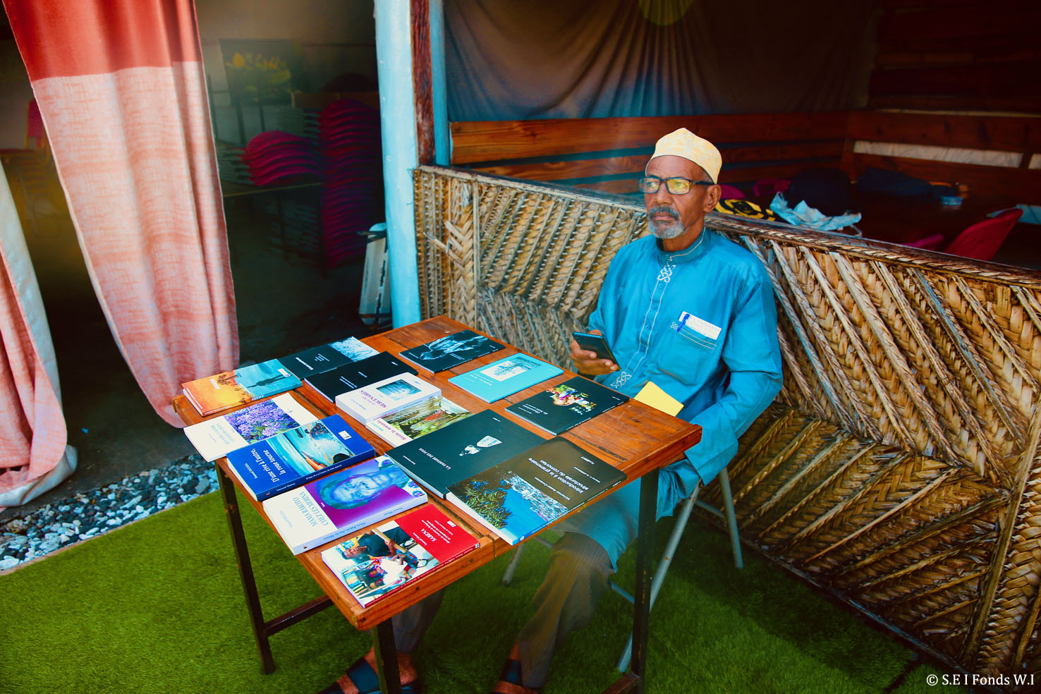 L’exposition, le stand Nouveautés, le gouverneur Anissi Chamsidine, auteur de Nisisu’ali Intsi – ceci n’est pas une réponse, le poète dramaturge Soeuf Elbadawi, auteur notamment de La fanfare des fous, lors des échanges avec les scolaires et les étudiants.