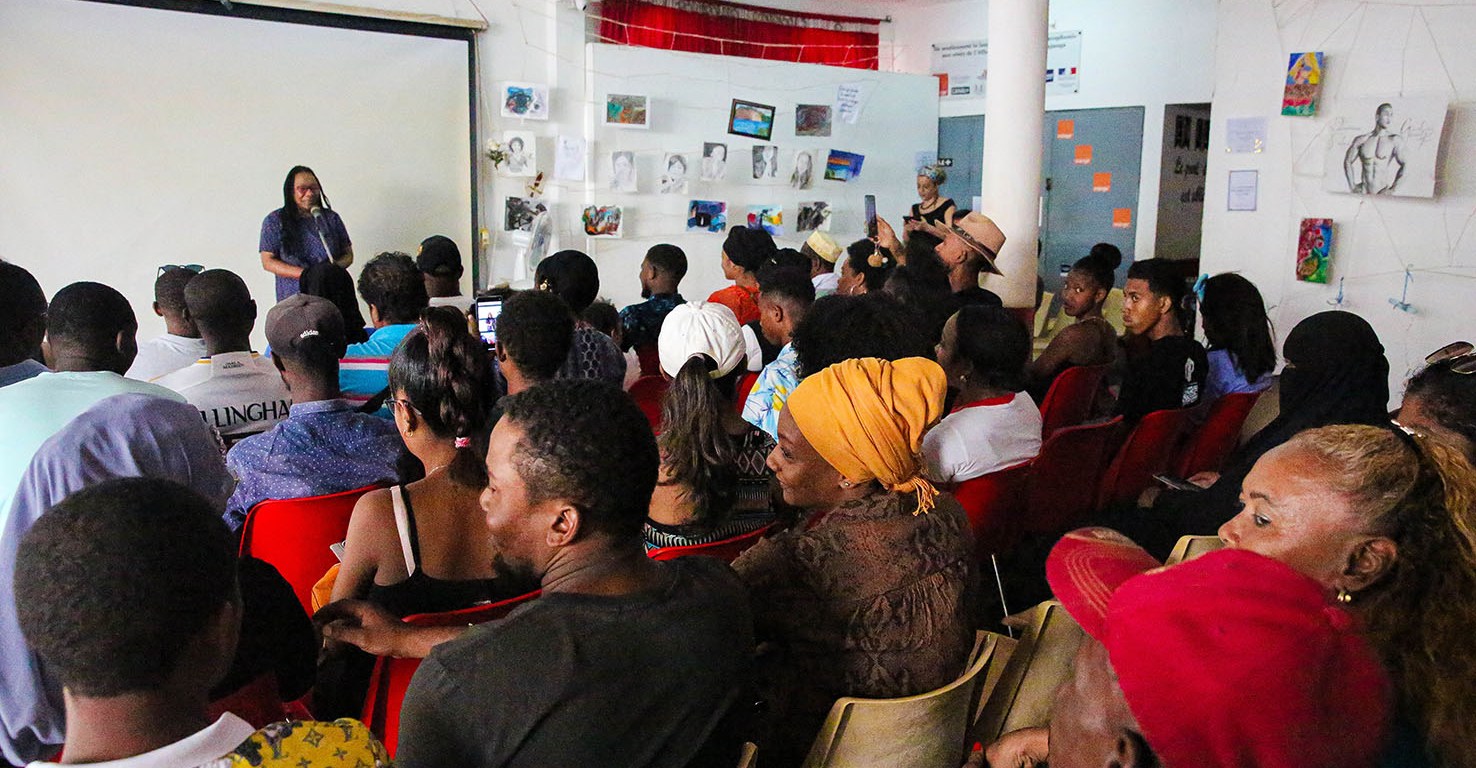 Le public lors de la présentation du film Zanatany à l’Alliance française de Majunga. Les acteurs, Hachimiya Ahamada, la réalisatrice, Chrystelle Lafaysse, directrice de l’Alliance à Majunga, Soeuf Elbadawi, samedi 21 avril 2024…