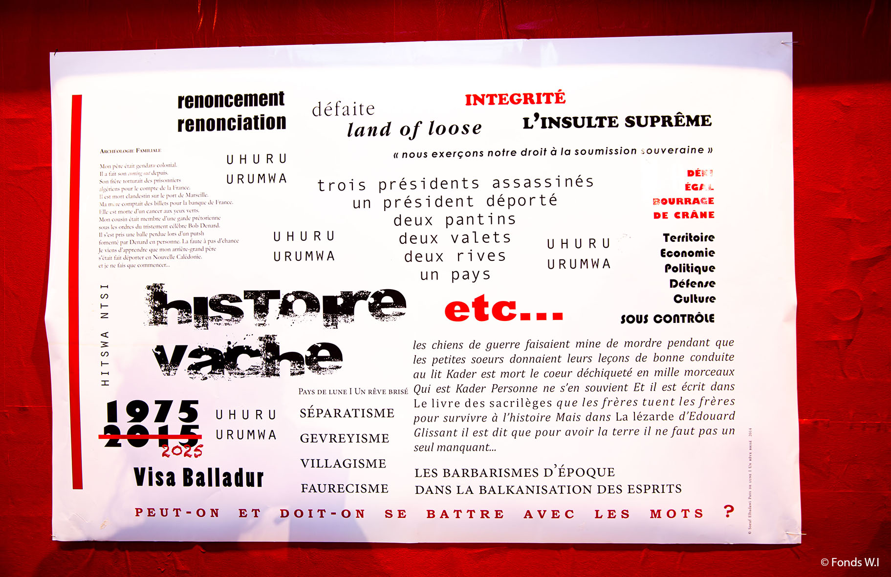 Une exposition sur les Comores s’est tenue du 11-15 février 2026 au Théâtre des Quartiers d’Ivry, CDN du Val de Marne, qui accueillait la pièce Je suis blanc et je vous merde de Soeuf Elbadawi (Passages et Traverses), mis en scène par l’auteur au sein de BillKiss* I O Mcezo*, sa compagnie. Une partie des pièces présentées date du FACC 2014 à Moroni, et interrogent la mémoire et le principe de dépossession coloniale. La scénographie de l’expo à Ivry était signée Margot Clavière.